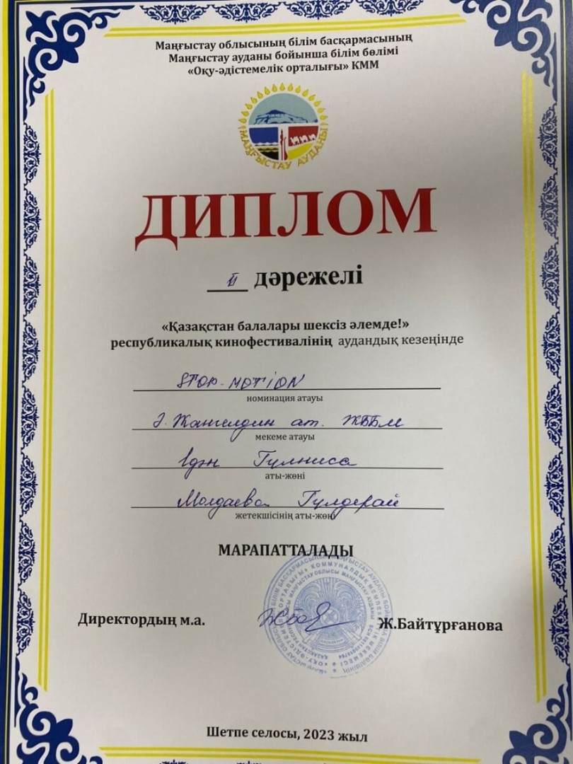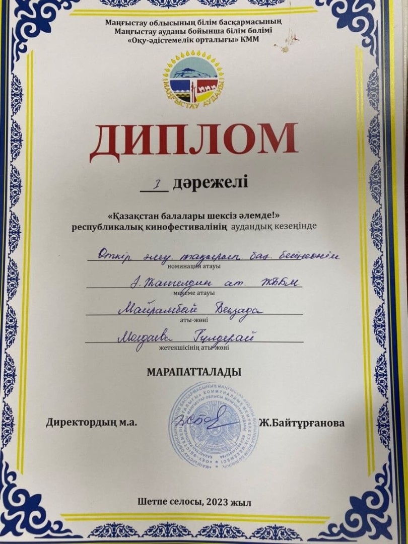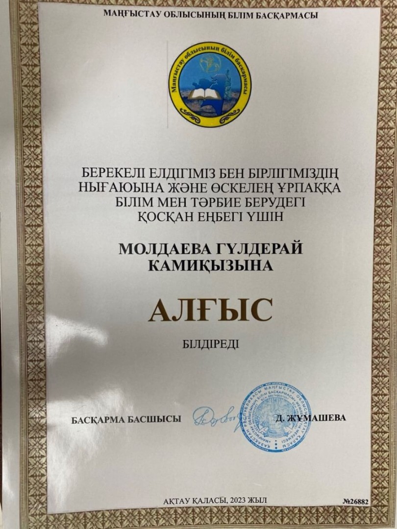 Маңғыстау облысының білім басқармасы «Алғыс хаты» 2023ж.